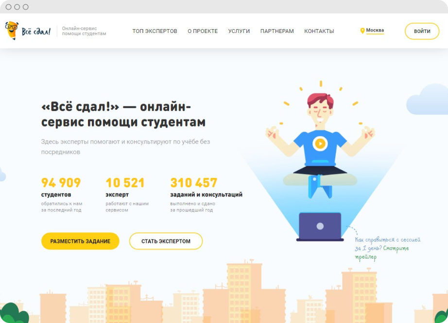 «Всё сдал!» — безопасный онлайн-сервис помощи студентам. Это автоматизированное платформенное решение, соединяющее заказчиков и исполнителей. Пользователи размещают заказ через личный кабинет, получают предложения, выбирают эксперта, а сервис выступает гарантом сделки.