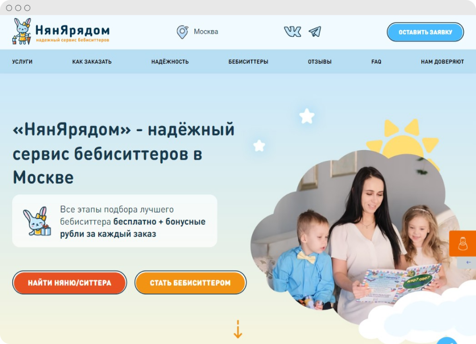 «НянЯрядом» — онлайн-сервис заказа бебиситтеров. Разработана платформа для удобного поиска нянь и мгновенного оповещения исполнителей в зависимости от требований заказчика.